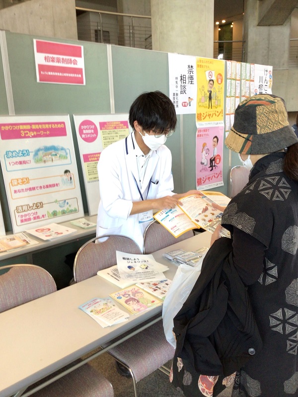 今回私は相楽薬剤師会と山城南保健所が共同で開いている展示ブースに参加させて頂きました。こちらのブースでは、かかりつけ薬局やジェネリック医薬品普及のためのポスター・パンフレットの展示と、禁煙相談や薬に関する相談が行われました。