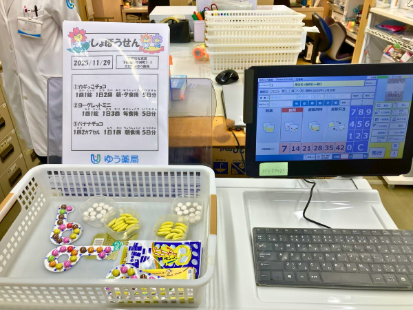 一包化は1日3回5日分の計15包を作ってもらいました。また袋の印字や日数の設定も自分で画面を操作して入れてもらいました。お菓子も3種類、全部服用のタイミングが異なるものでしたが、皆さん間違えずに作ることができました!できた一包化は監査という確認作業をして保護者の方に服薬指導を行いました。