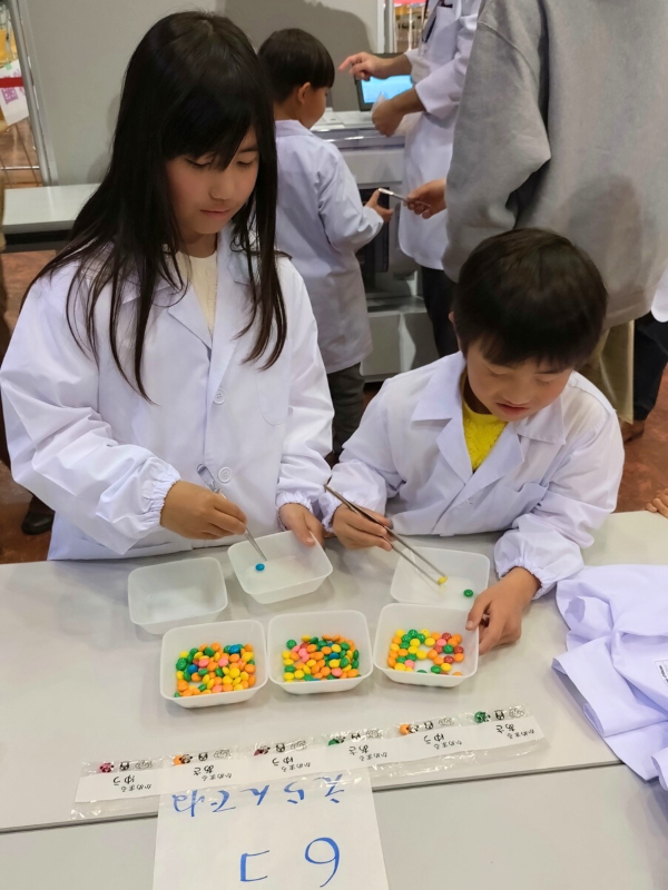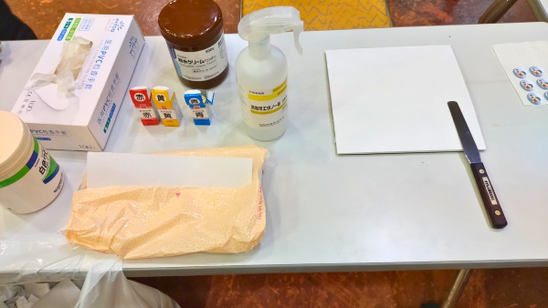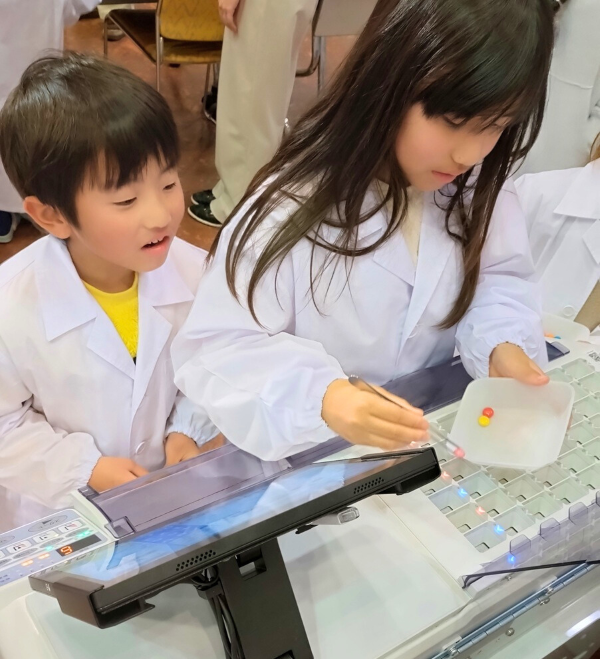 参加者自らがピンセットを使い、糖衣錠に見立てたチョコに悪戦苦闘しながら分包機に運んでおられました。体験された皆さん、普段は見られない薬剤師業務の一部を実体験し、「こんな作業を奥でしてはったんやね、これは時間かかるわ~」とおっしゃるので、こちらも「この1マスに10錠以上のお薬を入れることもあるんですよ、それも90日分とか」や「静電気でくっつきやすい薬もあったりするので、分包した後もキチンと落ちているか確認するんですよ」と追加情報を入れ、皆さん驚きとともに、作業の細かさや費やす時間に共感いただけた様子でした。