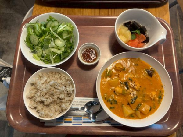 今月の管理栄養士監修ランチメニューは、きのこのバターライス、鶏肉のトマトクリームシチュー、栄養士の気まぐれサラダ、コーヒー寒天ゼリーとフルーツ~ジンジャーエールがけ~でした。