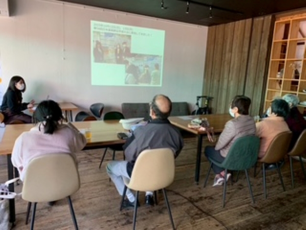 ミニ講座では、「学会発表報告~カフェと地域の関わりについて~」を弊社薬剤師よりお話させていただきました。今年の10月の学会でゆう薬局カフェに関するポスター発表をしたのですが、それにご協力いただきました皆様に「こんな内容で発表してきましたよ」と感謝の気持ちを込めてお伝えすることができたと思います。聞いてくださっている方はあの時の事がこんなしっかりまとめてあるんやと感心しておられました。