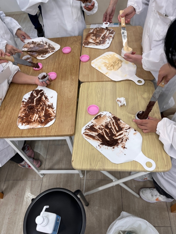 軟膏練りではジャムやチョコクリームを使い、体験用の処方箋を見ながら必要な量を容器から取り出し、まな板とヘラで混ぜ合わせてもらいました。分量通り取り出すのは皆さん上手にできていましたが、均一に混ぜるのが上手くできず戸惑っている方が多い印象でした。しかし薬剤師が隣で実物を使い見本を見せると分かりやすかったのか、綺麗に混ぜ合わせることができました。