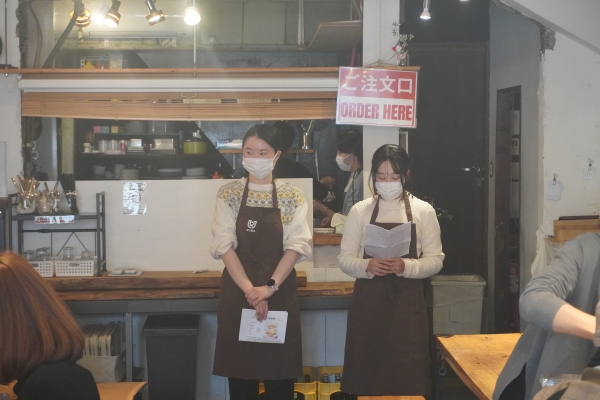 ランチ提供後には、管理栄養士によるミニ講座を開催しました。使用した食材に含まれるタンパク質・ビタミンC・食物繊維などの栄養素について、話がありました。初めて知られる内容も多かったようで、話の後にお客様から管理栄養士へ個別に質問もあったほどです。そしてなんと今回、帰り際に本日のメニュー解説のチラシとお土産までもらえて本当に500円か疑いたくなりました。