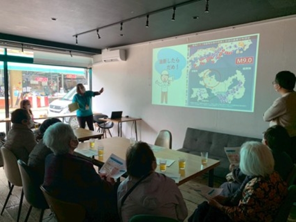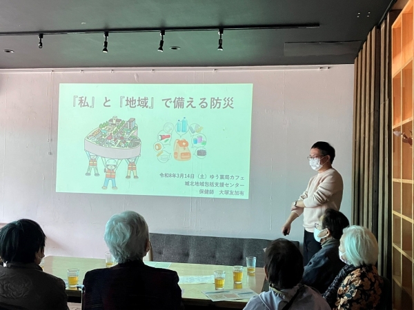 ミニ講座では、『「私」と「地域」で備える防災』というタイトルで城北地域包括支援センター 保健師 大塚友加有様とゆう薬局の薬剤師よりお話しいただきました。ローリングストックの方法やローリングストックに向いている食品のについて、お薬手帳を出かける際に持っていく等、日頃から災害時に備えて行動する大切さを学ぶことが出来ました。さらに災害用伝言ダイヤル「171」についてもお話いただきました。毎月1日と15日、防災週間期間中は実際に「171」にダイヤルすることで体験することが出来るので是非皆さんも一度試してみてください!