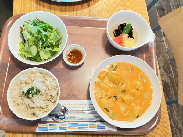 今月の栄養士監修ランチメニューは、きのこのバターライス・鶏肉のトマトシチュー・栄養士の気まぐれサラダ・コーヒー寒天ゼリーとフルーツ~ジンジャーエールがけ~です。