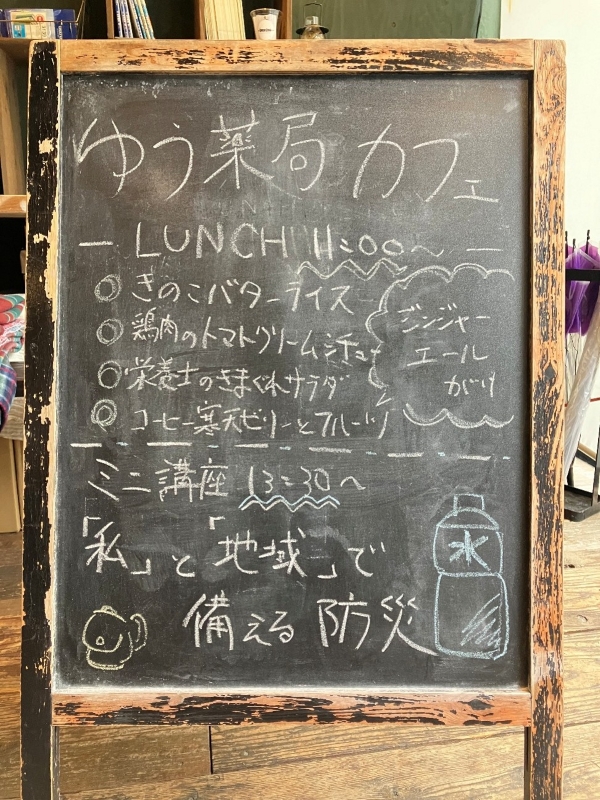 月1回、近隣の平野屋商店街にある日替わり店長で運営するCafé&Bar FLAT+で始めました“ゆう薬局カフェ”。近隣地域包括と協力のうえ舞鶴エリアスタッフが運営し、栄養士が監修したランチを提供、薬剤師や地域の専門職による相談対応・ミニ講座などを行い地域との交流を深めています。