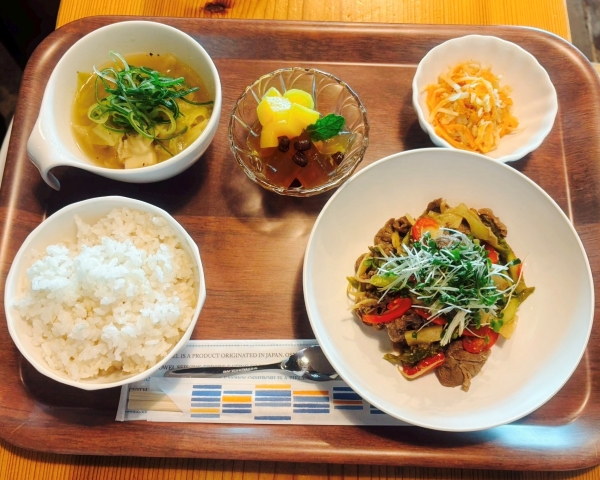 今月の栄養士監修ランチは、牛肉と春野菜のピリ辛味噌炒め、人参とじゃが芋の和え物、キャベツのコンソメスープ、ほうじ茶寒天ゼリーでした。今月から新メニュー!春野菜がたっぷりで塩分やカロリーが控えめとは思えないほど食べ応えがありとても美味しかったです。次回もメニューは続きますので、是非来月のカフェにお越しください!!
