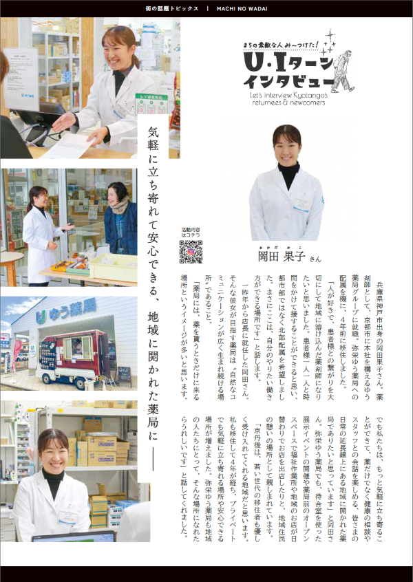 京丹後市が発行する市公式の広報誌(広報紙)にて、弥栄ゆう薬局の岡田果子さんが掲載されました。 ・「広報京丹後 2026年2月号(第263号)」 ・題名:【教えてこの人】 岡田果子さん(U・Iターンインタビュー)