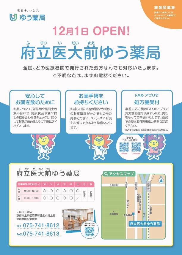令和7年12月1日(月)より京都市上京区に「府立医大前ゆう薬局」が新規オープンいたしました。