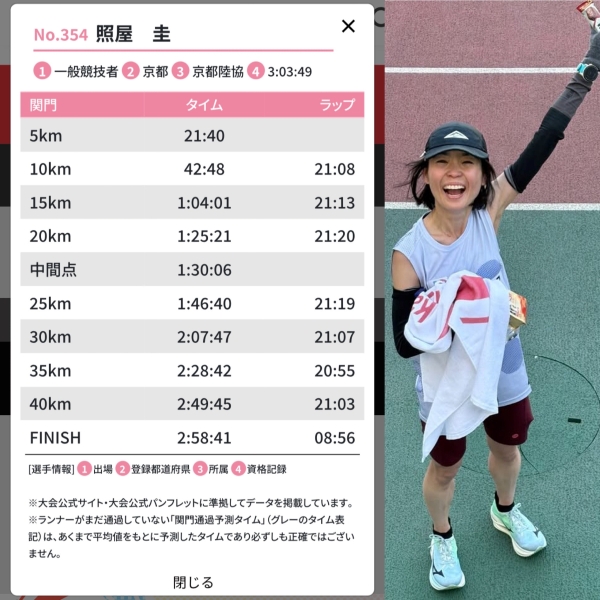 ゴール地点が分かりづらく、いつの間にかゴールしていましたが、結果は2時間58分41秒でした。当初想定していたよりも、終始余裕度のある走りができたため、笑顔で楽しく走りきることが出来ました。